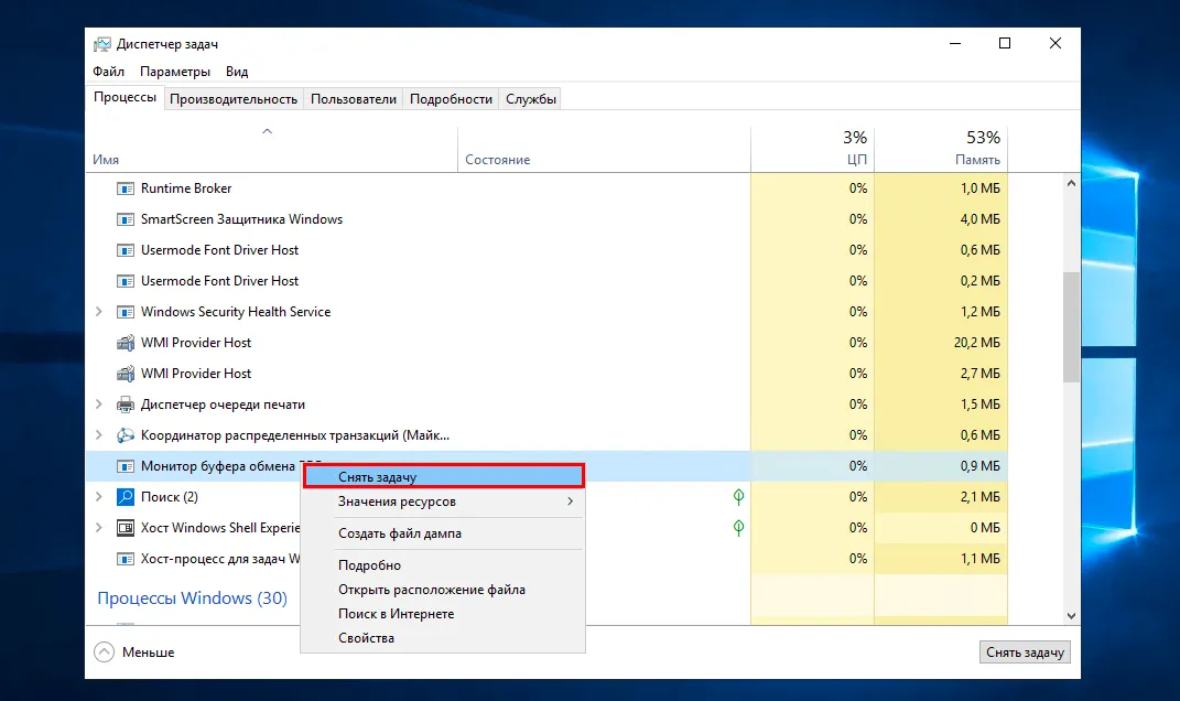 В открывшемся окне на вкладке Процессы найдите процесс rdpclip.exe или Монитор буфера обмена RDP, щелкните по нему правой кнопкой мыши и выберите Снять задачу.