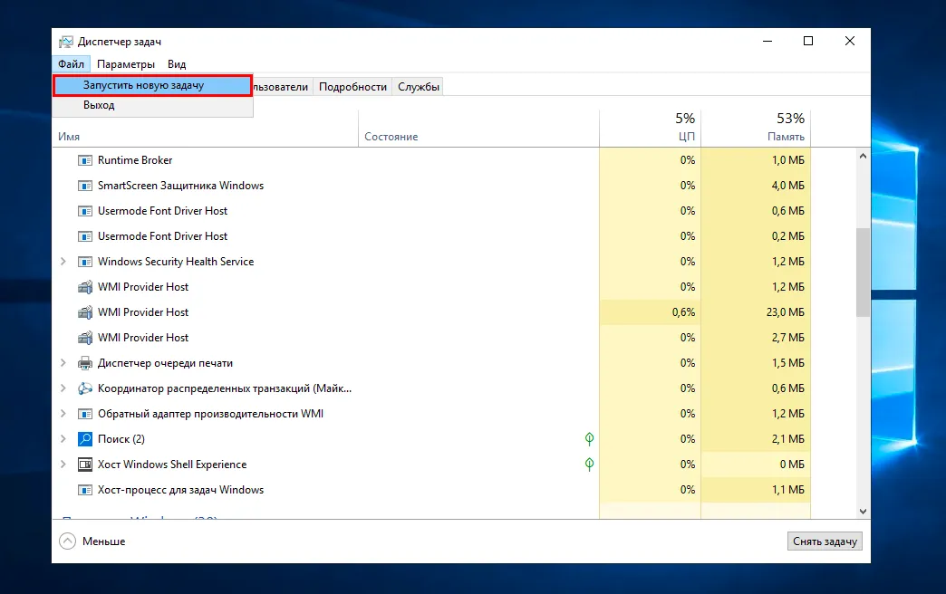 Чтобы запустить процесс заново, в том же окне Диспетчера задач откройте меню Файл → Запустить новую задачу.
