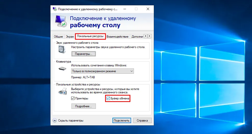 Для корректной работы буфера обмена убедитесь, что он включен в настройках подключения к удаленному рабочему столу: